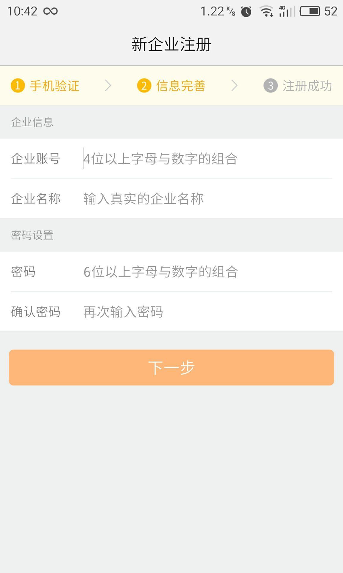 4.按照要求,填写注册信息,点击“下一步”,完成企业注册。